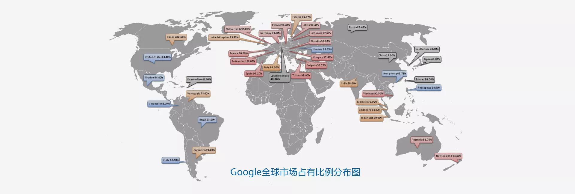 根据Alexa.com最新数据显示,Google全球PC用户使用率超过91.98%,移动端用户使用率超过95.14%。在南美洲使用率超过96.74%,欧洲使用率超过91.33%,北美洲使用率超过88.68%,大洋洲使用率超过93.4%,亚洲使用率超过88.81%,非洲使用率超过95.86%。
